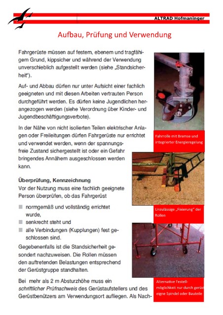 ALTRAD Hofmaninger Aufbau, Prüfung und Verwendung Fahrrolle mit Bremse und integrierter Energieregelung Unzulässige „Fixierung“ der Rollen Alternative Festell- möglichkeit nur durch gerüst- eigne Spindel oder Bauteile
